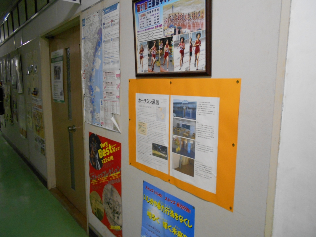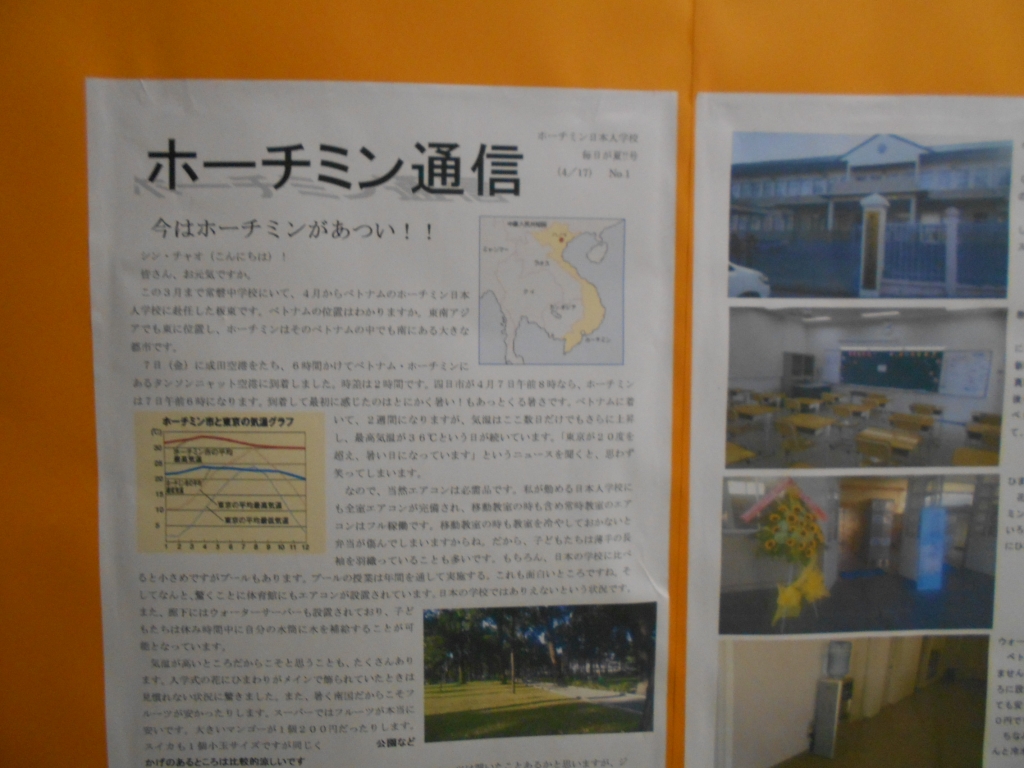 メールには、常磐中学校の皆さんへあてた「ホーチミン通信」が添付してありましたので、印刷して校長室前に掲示しました。生徒のみなさんはもちろん、保護者の皆様も ぜひ、「ホーチミン通信」をご覧ください。また、ベトナムの日本人学校と常磐中学校で交流もできるといいですね。校長先生は、ベトナムのめずらしい昆虫の写真を板東先生が送ってくれるのを楽しみにしているようです。