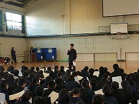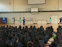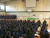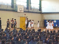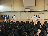 部活動紹介がありました。各部がそれぞれの活動を、作品紹介したり、実演したりして1年生に紹介してくれました。運動部の気合の入った掛け声や、文化部の美しい作品を見て、部活動の雰囲気を知ることができたと思います。仮体験期間は本日より17日(日)までです。4月19日には部活動を決定するので、よく考えて、3年間続けられる部活動を選んでほしいと思います。