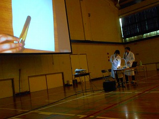 薬の正しい服用や、薬物乱用の恐ろしさをスライドや実験を交えて伝えていただきました。実習生の脇木先生にも協力していただきました。
