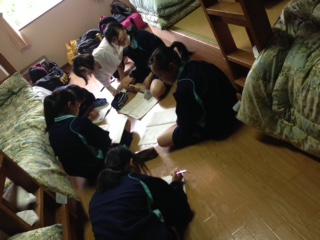 部屋で、今日の活動について振り返り、それをしおりに書いています。