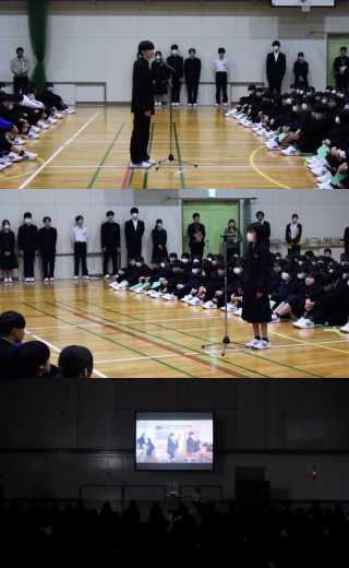 4月9日 全学年そろって対面式を行いました。生徒会代表からようこそ常磐中へのあいさつが、新入生代表からはよろしくお願いしますのあいさつがありました。そのあと生徒会から常磐中学校の日常生活についての動画映像と説明がありました。生徒会の皆さんありがとうございました。