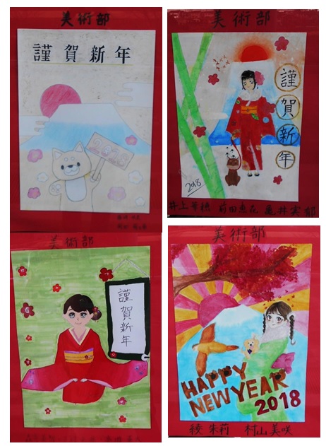 美術部が生徒玄関に掲示してくれた、お年賀のあいさつです。