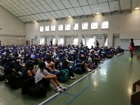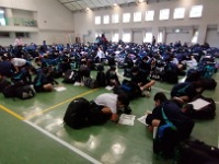 あいにくの雨で足元が悪く危険と判断し、午後からの観音山公園散策(登山)は、残念ながら中止としました。鈴鹿青少年センターに予定より早く到着したため、夜のレクのビンゴで使う関宿かるたの頭文字を班で相談してしおりへ記入をしています。
