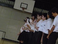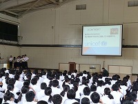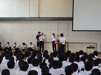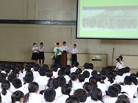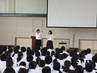 本日の6限終了後、生徒集会が行われました。最初に生徒会からのあいさつと体育祭メドレーリレーの説明が実技を交えて行われました。 続いて各委員会からの報告の後、3つの委員会から委員会発表が行われました。最初の福祉委員会の発表では、ユニセフ募金の取り組みについて、スライドを使って説明がありました。 《校内のユニセフ募金は7月3日~7月10日まで行われます。大勢の方のご協力をお願いします。》つづいて緑化委員会からは日常の水やりについて、実演を交え、スライドを使って紹介がありました。最後に図書委員会からは、図書室のどこにどんな本か置いてあるか、おすすめの本の紹介がありました。夏休みの本の貸し出しは7月3日からで一人5冊まで借りられること、返却は9月3日で、返却期限を守ってほしいことなどの連絡がありました。集会の最後には、代議員から「入場は静かにできたが、途中話し声が聞こえたこと」「みんな顔を上げて聞いており、よかったこと」などの反省がされ、生徒集会を終えました。