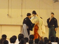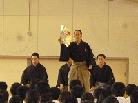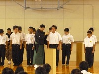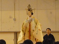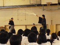 本日、鎌倉能舞台の方に来ていただき、2・3限目に能狂言教室を行いました。あいさつの仕方や謡曲「高砂」を指導していただいたり、中学生にはなじみのうすい能について、その歴史や能における所作があらわす意味、面の角度のよってあらわす表情について、説明していただきました。その後、屋島と土蜘蛛を仕舞(衣装や面をつけずに舞うこと)で見せていただきました。また、能の動きを体験させていただいたり、「羽衣」のさわりを実演していただきました。実際、前で体験できた生徒は、貴重な体験になったことでしょう。また、多くの生徒にとっても日本の伝統芸能である「能」を知ることができた一日になりました。