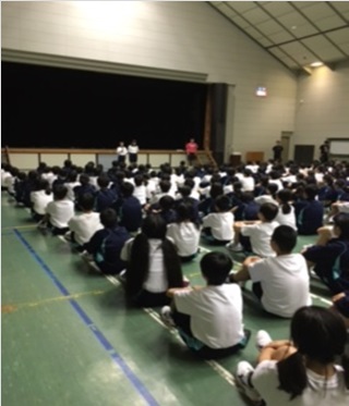夜の集いを総合研修館で行っています。一日を振り返って、今日の成果と反省を行います。実行委員の生徒が中心になって進行しています。