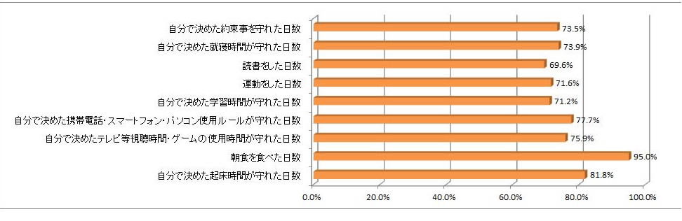 「みえの学力向上県民運動」(10月25日から11月1日まで実施)のアンケート結果です。自分の決めた読書、運動、学習、起床・就寝時間を守れているかをチェックしました。