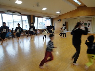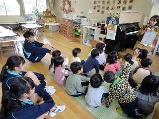 クラスに分かれ活動スタート。ホールでは「サクランボ~」をしていました。