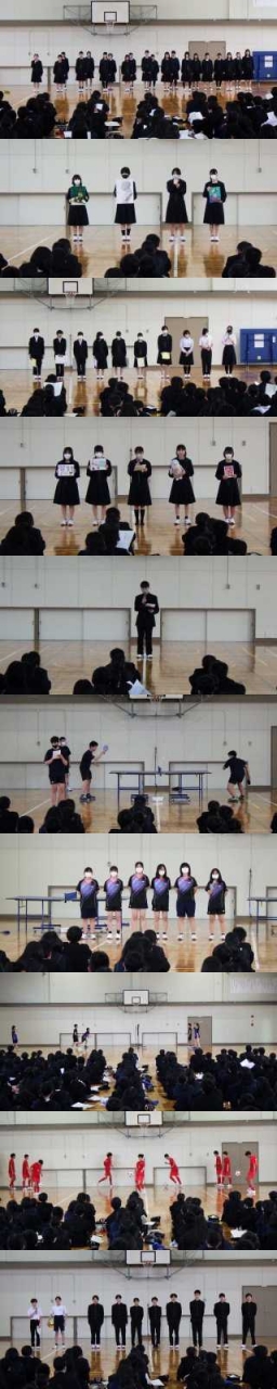 新入生に対して部活動紹介を行いました。今年から部活動の所属は任意となります。前半は1音楽部、2美術部、3文芸部、4家庭部、5パソコン部、6卓球部男子、7卓球部女子、8バトミントン部、9サッカー部、10バレー部男子でした。