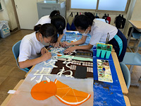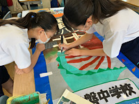 秋に行われる国体の応援のぼりが3年生も完成が近づいてきました。部活動の合間に有志の人達が作成をしているので時間がかかっていますが、「もっとこうしたい」と工夫やアイデアを出し合って作成しています。