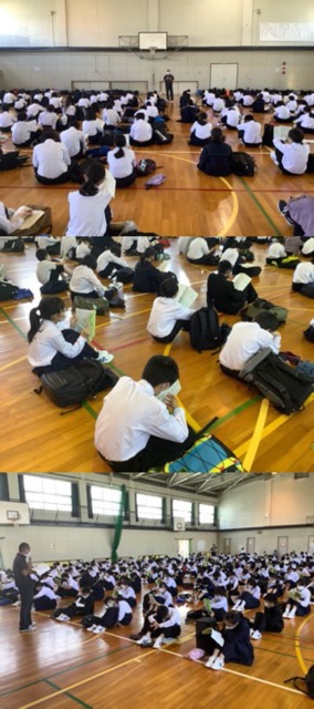 今日は自然教室の事前指導です。最初に実行委員会から自然教室のスローガンの説明、続いて日程の説明があり最後に荷物の忘れ物がないかチェックしました。