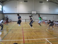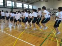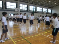 昨日7日から体育祭練習がはじまりましたが、お天気に恵まれません。昨日は雨の間を縫うようにグラウンド練習をしました。しかし、グラウンドは水たまりがたくさんあり、思い通りの練習が出来ない日々です。今日も朝から雨。3時間目4時間目に練習をしましたが、全て体育館で行われました。こんな状況の中でも、一生懸命に練習を重ねる生徒達の姿。とても素敵です。今日は大縄跳びの練習をしました。先生たちが先に手本に跳びました。中学生は当然その上の数を跳ぶはず(?)明日こそ晴れてほしいですが、台風が接近しているのが心配です。
