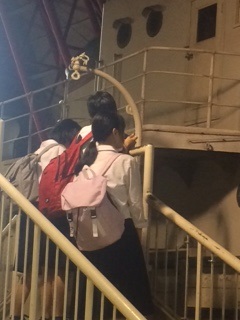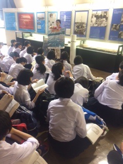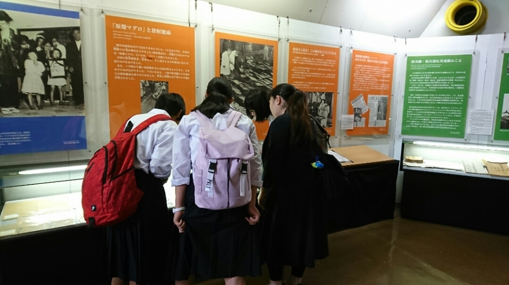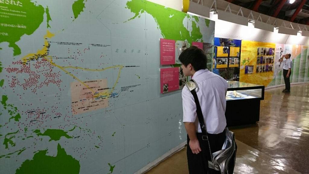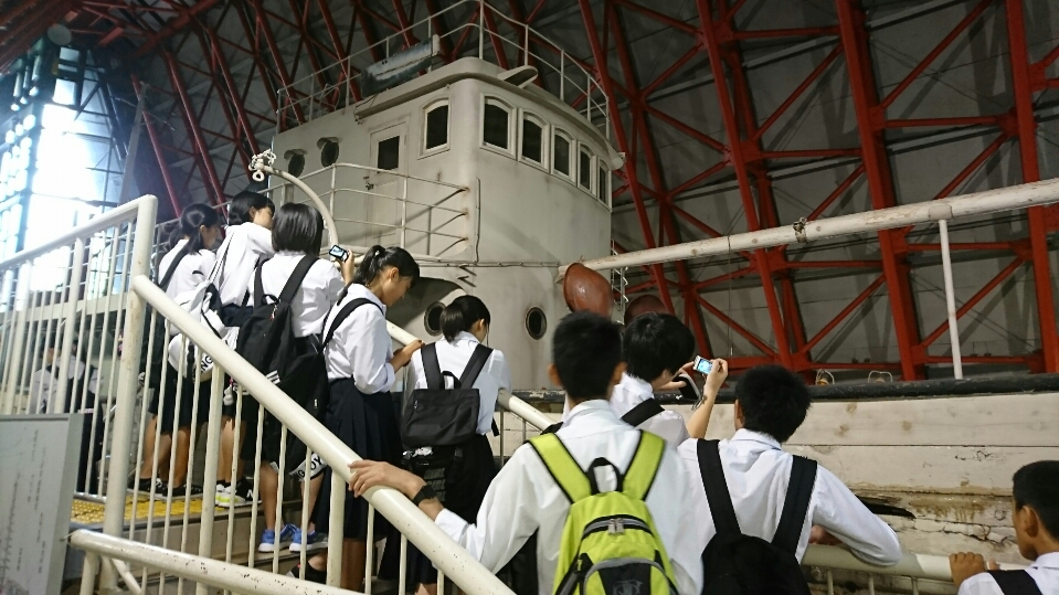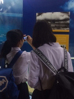 第五福竜丸展示館 展示品を写真に撮っています。 撮った資料は帰ってからの新聞作りに使います。
