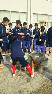 今年度は保護者会のご厚意で、餅つきをしました。はじめて杵をもつ子もおり、フラフラしながらついていました。つきたてのお餅はやわらかく、菜餅やおろし餅、きな粉餅などにしておいしくいただきました。