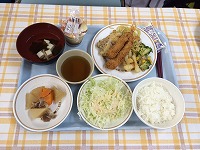 今日の夕食のメニューは、エビフライ、肉じゃが、魚などの料理です。