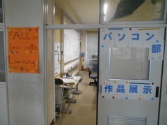 美術部、文芸部、家庭部、パソコン部、理科部、音楽部の部活動展示。
