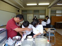 今日の2限目に生活学級の理科の時間に実験として、アイスクリーム作りをしました。最初に、ボールに牛乳・生クリーム・卵・砂糖を入れかきまぜました。