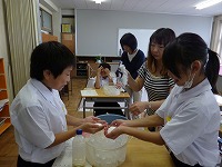 写真は、氷の温度をより冷やすために塩を入れている所です。塩は解けるときにエネルギーを必要とします。そのエネルギーを周りから奪うため、氷がより冷えるという実験でした。この実験のため、何度も水槽内の温度を計り、記録していきました。この一時間では、アイスクリームは、固まらなかったため、残念ながらこの日には食べられませんでした。