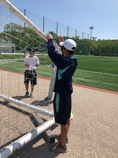四日市市スポーツ協会の体験です。中央緑地の新しいサッカー場で使うゴールネットをつけています。