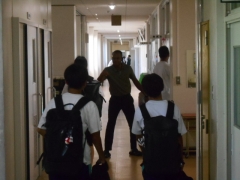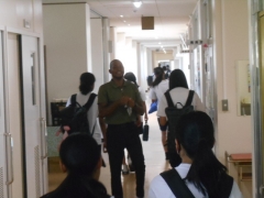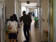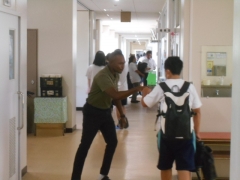 新学期2日目のスタートを生徒玄関付近で迎えてくれたのは、今学期からお世話になるALTのエリアス先生です。