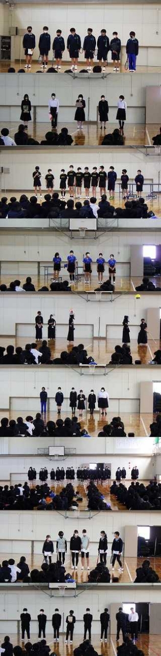 部活動紹介の写真の続きです。上から①男子テニス部②文芸部③男子卓球部④女子卓球部⑤剣道部⑥美術部⑦音楽部⑧女子テニス部⑨男子バレー部です。1年生の皆さんよく考えて部活動を選んでください。