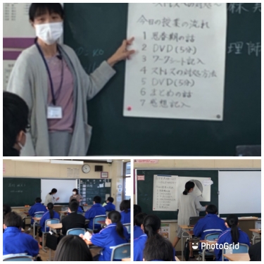 今日と来週の火曜日に1年生では、本校のスクールカウンセラーの嶌村先生に「自分を大切にしよう〜ストレスへの対処〜」について授業をしていただき、ストレスを対処する方法を知りました。人それぞれ悩みがあることは当たり前です。つらい気持ちになったときに、信頼できる誰かに相談することです。自分で抱え込まないでくださいね。また、まわりにそういう子がいないか周りの様子もみてくださいね。