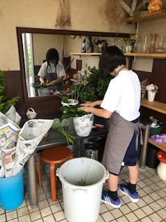 お花の水変えをしています。花が長持ちするように茎の先を少し切ってから水をかえた花瓶の中に戻します。