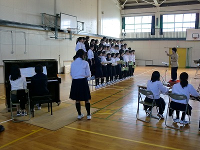 オペラ歌手の馬場浩子先生にお越しいただき、3年生の合唱指導をしていただきました。全校合唱曲「君に会えたことに」を3年生全員で歌った後、各クラス15分の持ち時間の中で指導をしていただきました。音楽の授業で練習した合唱曲は、馬場先生の指導で歌うたびに良くなりました。馬場先生の指導にも熱が入り、持ち時間を越しての指導が続きましたが、どのクラスも真剣に先生のアドバイスに耳を傾けていました。今日の講習会で指導していただいたことを元に、これからのクラスでの練習をさらに良いものにしていってほしいと思います。