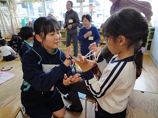 こちらではあやとりをしていました。膝をついて目線が合うよう配慮。