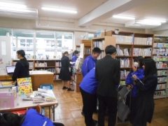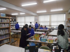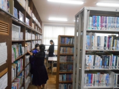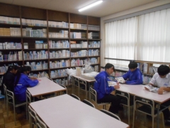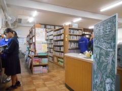 お昼休みの図書館の様子です。お昼休みになると、たくさんの生徒が図書室にやってきます。