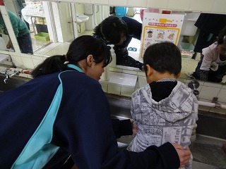 さあお昼の時間。石鹸で手を洗いましょう。できた?と確認。