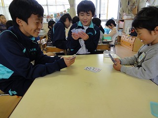 トランプ遊びを一緒に。なかなかそろわないね~。