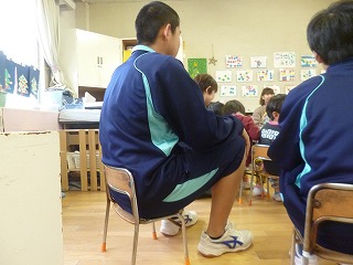 園児の椅子に。自らの成長を感じるシーンでもあります。