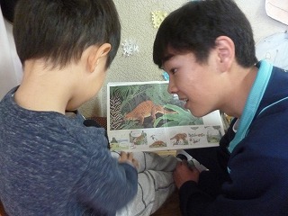動物の絵本を見ながら。優しい笑顔が印象的です。
