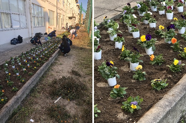 緑化委員会が、花壇にパンジーを植えてくれました。