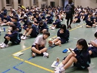 夜の集い後に、夜食タイムでドーナツとジュースを食べました。夕食が早かったこともあって、みんな嬉しそうに食べていました。この後は部屋に戻り、1日目の振り返りをしおりに記入し、10時に消灯・就寝となります。明日の活動に備えて、しっかり寝ましょう。