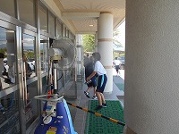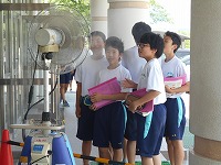 保健体育の授業帰りに生徒玄関前で、生徒は涼しそうにミストを浴びています。