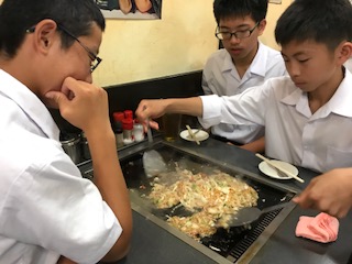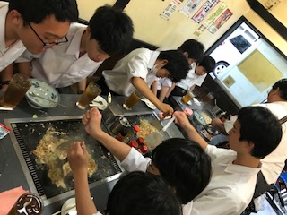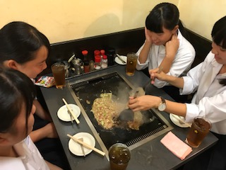 夕食はもんじゃ焼です。店員さんから焼き方を教わっています。