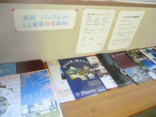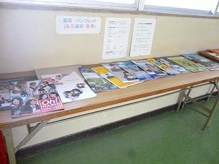 2年生は、キャリア教育として職業体験を行ったり、将来を見通して自分自身の生き方を見つめなおしたりしています。中学校卒業後の進路として、高校を選択する生徒が多くいますが、どんな高校があるのかを知るために、3年生から高校のパンフレットを借りて廊下において、自由にみられるようにしています。