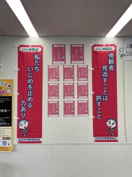 【お知らせ】11月はいじめ防止強化月間三重県や四日市市では、11月に「いじめ防止強化月間」の取り組みを行っています。11月4日(月)常磐中では「人権のぼり旗」を生徒玄関に掲げました。四日市市では、市内各校から募集した「いじめ防止標語」の優秀作品をポスターに、小中学校で1作品ずつ選ばれた最優秀作品をのぼり旗にし、総合会館1階の人権広場等のスペースに展示しています。【四日市市HP】詳しくは ➡ コチラ三重県では、児童生徒が安心して学習その他の活動に取り組むことができるよう、学校の内外を問わずいじめが行われなくなるようにすこと等を基本理念とした「三重県いじめ防止条例」を平成30年4月から施行し、今年で8年目を迎えました。条例では、いじめの防止に関する県民の理解を深め、社会総がかりでいじめの問題を克服するため、毎年4月及び11月をいじめ防止強化月間としています。◆三重県いじめ防止強化月間 詳しくは ➡ コチラ