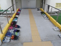 練習前の体育館入口の写真。整然と並べられた靴が練習風景を想起させます。強くなりたい。次の試合で一勝でも多く勝ちたい。良いチームにしたい。生徒の声が聞こえてきそうです。