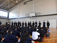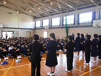 体育館で集会を開き、自然教室実行委員会がスローガンを発表しました。気温も高くなってくる中、最後まで集中して話を聞くことができました。