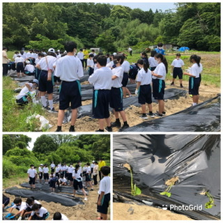蒸し暑い中、1年生は吉田山の農園でさつまいもの苗植えを行いました。