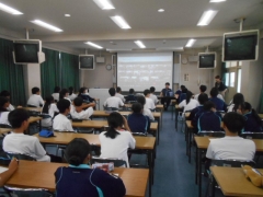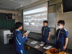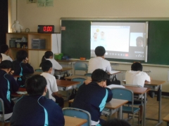 出前授業は、視聴覚教室に集まった生徒会役員と各クラスの代表生徒へ対面で行われ、その内容が全校生徒へ配信されました。