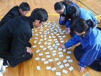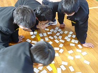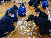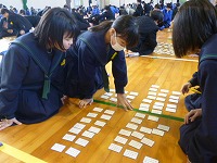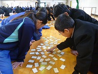 1月26日(火)の6限目に、1年生は百人一首大会を行いました。25日の6限目に各クラスで練習を行い、その時の獲得枚数を参考にした43のグループに分かれて実施しました。何枚もとっていく生徒、なかなかとれないながらも一生懸命に札を探す生徒などさまざまでしたが、みんな楽しそうに取り組んでいました。充実した1時間になりました。