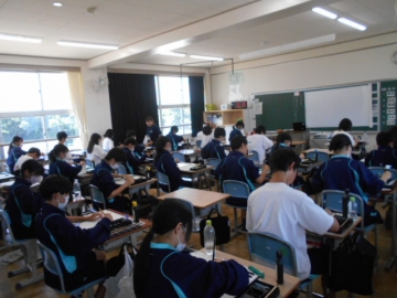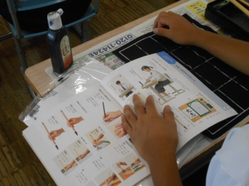 教室はエアコンのおかげで快適です。1年生の国語科では、習字の授業が始まりました。