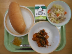 本日のメニューは、米粉パン、牛乳、タラとジャガイモのケチャップがらめ、型抜き野菜とABCポトフ、みかんジャムです。