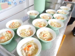 また、「ポトフ」には苦手な野菜も楽しく食べられるように、型抜きされた野菜やアルファベットマカロニを使って、見た目を楽しくする工夫も取り入れています。ラッキー野菜を探しながら楽しくいただきました。