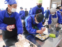 今年度の給食週間では、SDGs達成のために、生徒の皆さんが考えたアイデアを取り入れた献立や地場産物が多く登場します。今日の「手巻きごはん」はごはんがしっかり食べられる工夫として、おにぎりのように海苔でご飯や具を巻いて楽しく食べるアイデアです。また、「地物いっぱい沢煮椀」に三重県産の豚肉、油揚げ、ネギが使われています。