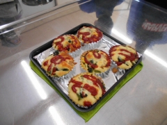 ホットケーキミックスを使って、ツナ、ホウレンソウ、ベーコン、コーンを入れ、チーズやケチャップを乗せて焼き上げました。